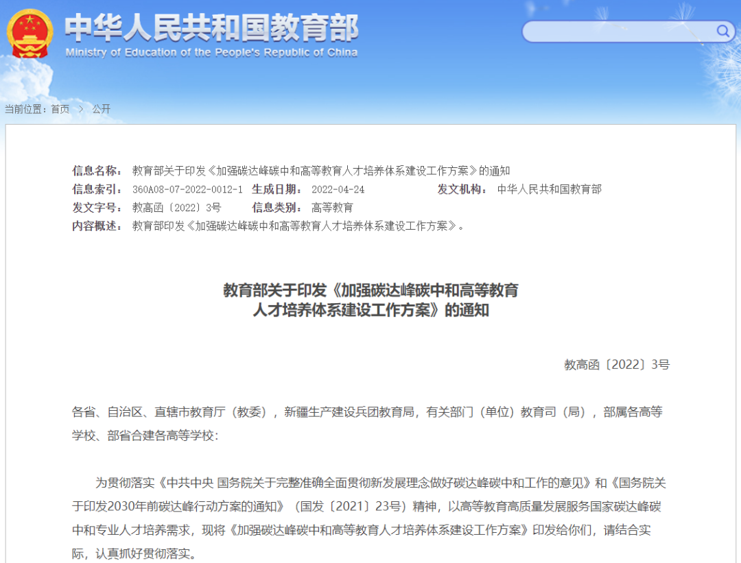 教育部关于印发《加强碳达峰碳中和高等教育人才培养体系建设工作方案》的通知